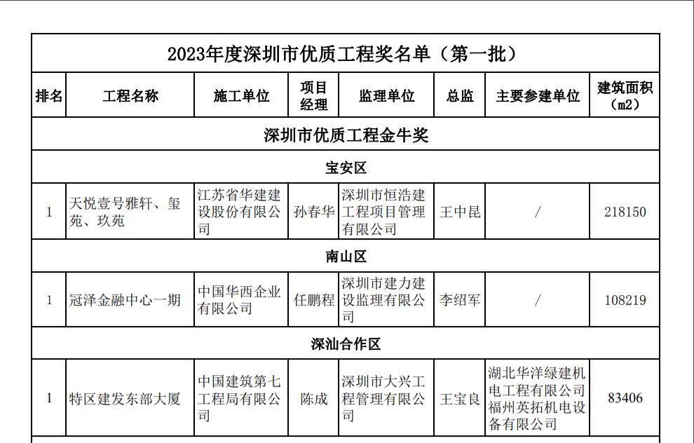 根據(jù)《深圳市建設(shè)工程優(yōu)質(zhì)獎評選辦法》,深圳建筑業(yè)協(xié)會工程質(zhì)量工作委員會組織專家對申報(bào)2023年度深圳市優(yōu)質(zhì)工程的項(xiàng)目進(jìn)行了檢查,由委員會審核、復(fù)查后向社會公示,并經(jīng)深圳建筑業(yè)協(xié)會八屆七次常務(wù)理事會議審定,共有41個工程項(xiàng)目被評為2023年度深圳市優(yōu)質(zhì)工程獎,其中金牛獎5項(xiàng)?,F(xiàn)將本次獲獎項(xiàng)目中已經(jīng)完成政府法定相關(guān)手續(xù)的29項(xiàng)工程予以公布并表彰。